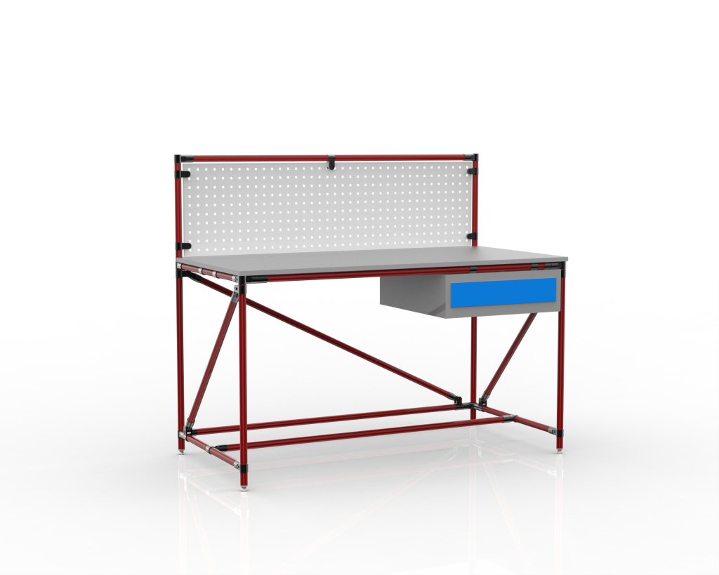 Werkbank mit Lochwand aus einem Rohrbaukastensystem. Der Tisch umfasst eine beidseitig laminierte Spanplatten-Arbeitsplatte mit einer Stärke von 18 mm, einen Schubladencontainer, eine Lochwand zum Aufhängen von Werkzeugen oder Boxen und vier verstellbare Füße. Tragfähigkeit bei gleichmäßiger Belastung 100 kg. Abmessungen 1282 x 1500 x 750 mm.