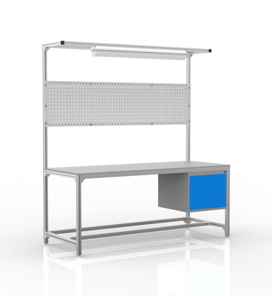 Werkstatttisch aus Aluminiumprofilen. Der Tisch umfasst eine Laminatplatte, einen Tischbehälter, eine Lochplatte zum Aufhängen von Kisten oder Werkzeugen, LED-Beleuchtung und höhenverstellbare Beine. Dank der Verwendung von Aluminiumprofilen ist der Tisch leicht und gleichzeitig sehr stabil. Belastbarkeit bei gleichmäßiger Belastung von 150 kg. Abmessungen 2200 x 2000 x 790 mm.