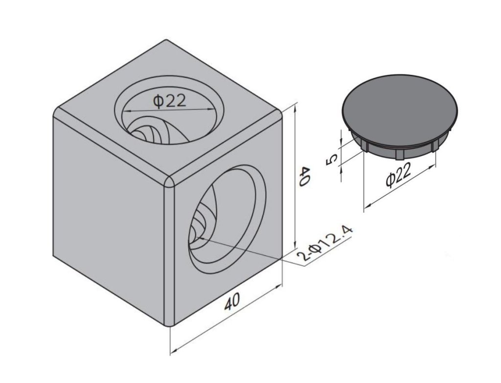 Würfelförmiger Verbinder für die rechtwinklige Verbindung von 2 Aluminiumprofilen. Abmessungen 40x40x40 mm. vollständige Beschreibung und Parameter