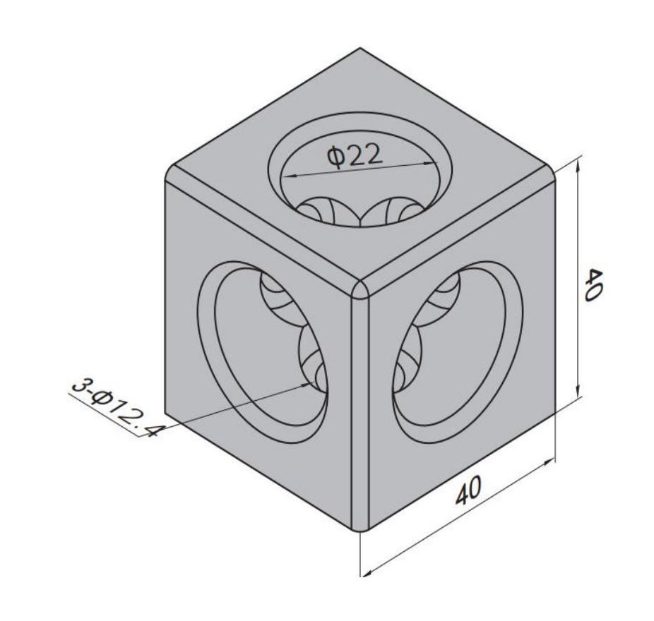 Würfelförmiger Verbinder für rechtwinklige Verbindung von 3 Aluminiumprofilen. Abmessungen 40x40x40 mm. vollständige Beschreibung und Parameter