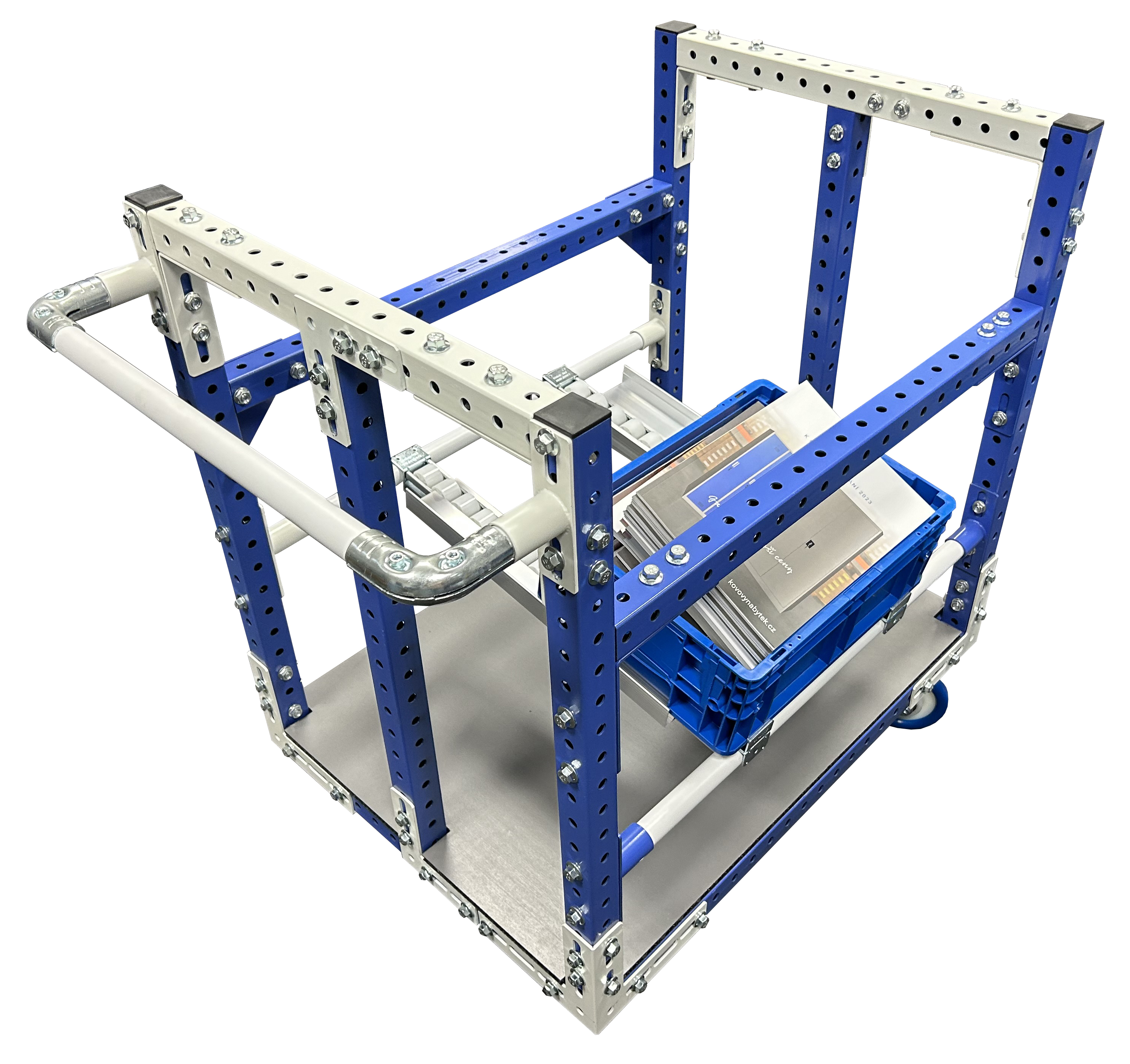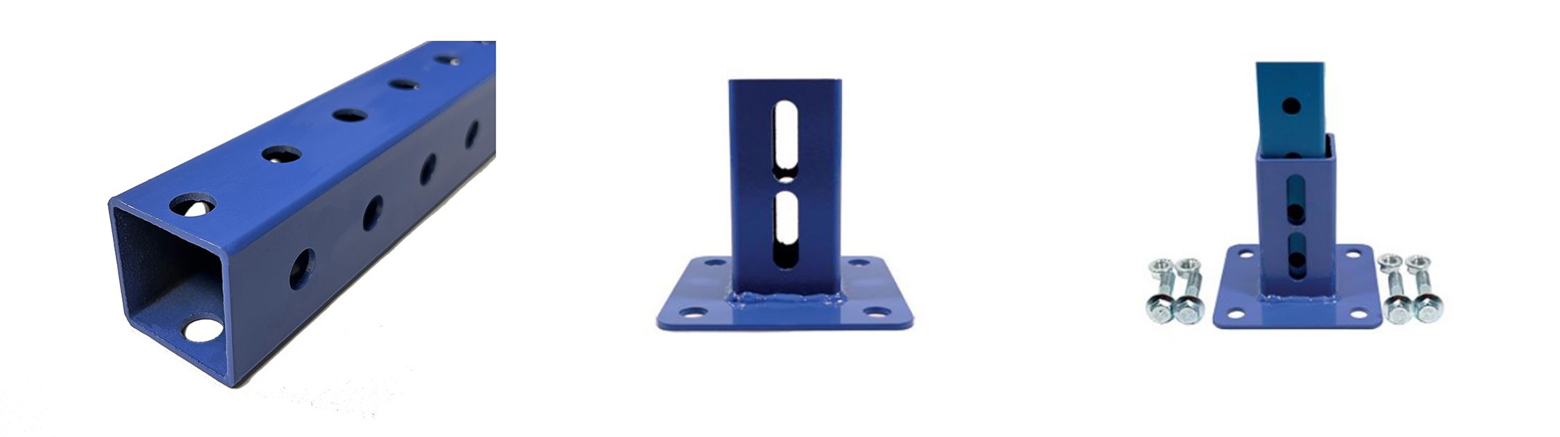 Basis des Gesamtsystems sind gelochte Vierkantrohre mit einer Abmessung von 40 x 40 mm und einer Materialstärke von 2 mm. Regelmäßige Perforationen sind nicht nur ein ästhetisches Element, sondern auch eine effektive Möglichkeit, bei der Montage Zeit zu sparen. Jedes Vierkantrohr verfügt über eine präzise Lochanordnung, was den Montageprozess vereinfacht und beschleunigt, ohne dass sich der Mitarbeiter um zusätzliche Materialvorbereitung kümmern muss. Das System verwendet M10-Gewindebolzen für das Zubehör und M8 für die Räder. Darüber hinaus kann das gesamte System mit nur 2 Schraubenschlüsseln zusammengebaut werden, ohne dass Schweißarbeiten erforderlich sind.